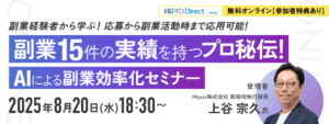 6位 | 本業との両立 | 時間管理の秘訣は“仕組み化”と“生成AI活用”。考えることに9割の時間を割くのではなく、実行に9割の時間を使います。業務委託契約は時間ではなく成果です。 |